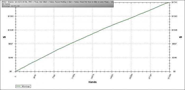 kirapwnz, в общем я поломал голову, но пока что не могу придумать как до конца правильно отфильтровать маленькие банки где мы теоретически можем поставить контбет. Но то разбиение, которое ты предложил, считаю некорректным и очень искажающим статистику. В банки от 0 до 3 бб входит громадное количество случаев когда мы сбрасываем руку на блайндах, поэтому практически у всех регуляров там будет минус. Банки 3 - 13 бб, как ты написал, не отражают весь спект банков где мы можем поставить или ставим контбет, так как размер таких банков при наличии многих лимперов, а также учитывая тот факт, что контбет могут заколлить, может составлять до 30 бб. Приближенно, если взять банки до 15 бб и применить следующие фильтры: pfr = true, did 3bet = false, faced preflop 3bet = false, final pot size is less than 15bb. Этими фильтрами мы примерно выделяем интересующие нас банки, а также отсекаем все потери блайндов когда мы просто сбросили и не входили в розыгрыш. Но проблема тут в том, что тут также учтены случаи когда мы просто забрали банк рейзом на префлопе и никто не сопротивлялся. С одной стороны это можно считать как выигрыш маленького банка, ведь мы были рейзером и активно вступили в розыгрыш, это как бы наша заслуга. Но с другой стороны, это не совсем корректно отображает ситуацию именно с контбетами. Я сам хочу разобраться что может быть не так. Критика и замечания приветствуются. Получилось как-то так: График №1 Банки до 15 бб с фильтрами, которые я описал выше. График №2 Банки более 50 бб