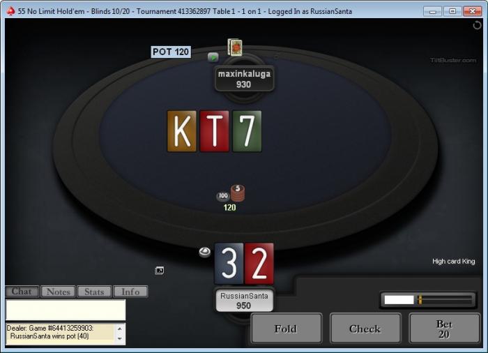Poker Stars, $6.67 Buy-in (10/20 blinds) No Limit Hold'em Tournament, 2 Players