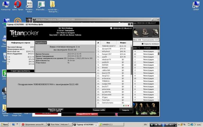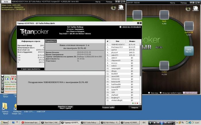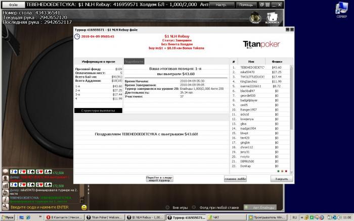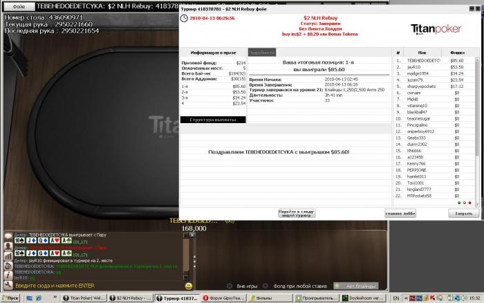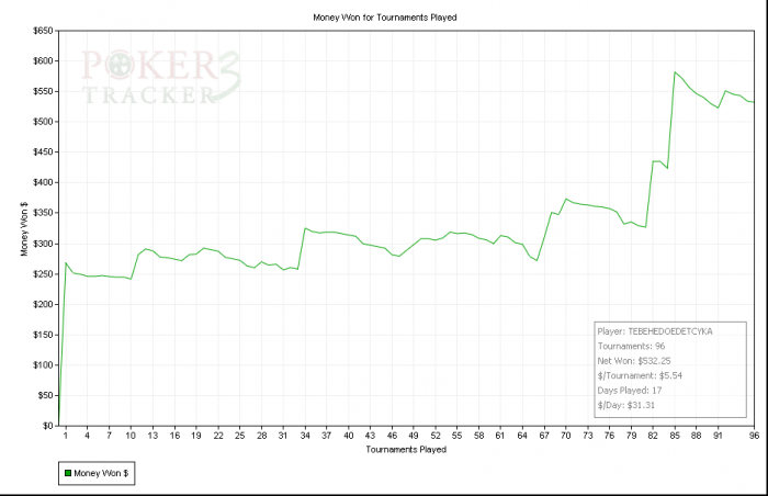 Турик был ребайник по 50 грн. (182 р.) Насобиралось 39 человек. Структура - просто ужаснейшая, на финалке средний стек был 4ББ. Постфлоп игры -ноль. Но знание пушбота помогло Поле, откровенно сказать, настолько слабое, что даже с такой структурой можно спокойно играть. Вышел в ХА и спокойно поделили с чуваком по 1300грн.(4755р.)