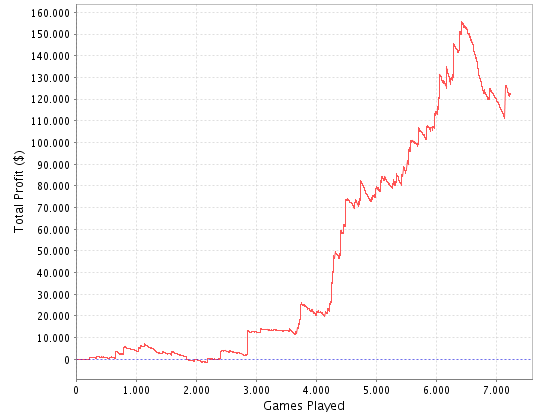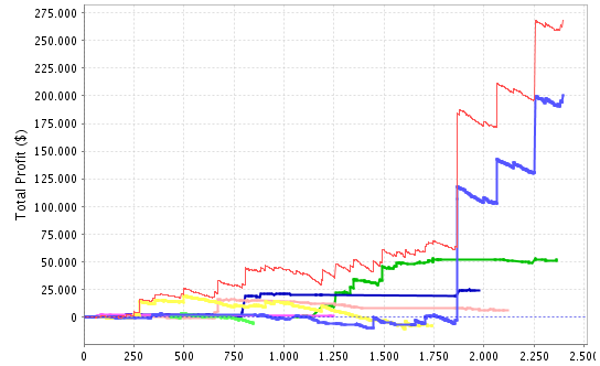 Если бы вы озадачились методами математической статистики и эконометрики найти на этих графиках какие то паттерны... может чего и вышло бы. Да и то, не связано в покере прошлое и настоящее, ну никак не связано. Каждый турнир- отдельный турнир, каждый олин это отдельный олин. На рынке же ценовой ряд непрерывен (хотя тоже дискретен до тиков) и есть связь как минимум с ближайшим прошлым и настоящим.