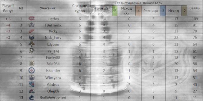 Wintyara @ 21.12.2011 Nick, в общей таблице указано, что я угадал точный счет только 1 раз, а в прошедшем туре я это сделал 2 раза. :) Ошибка вероятно.