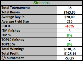 Наконец вернулся к турнирам, замечательно они меня встретили. Играешь отлично, везде переезжают или не выигрываются коины, а играть больше 4-5 столов на ноуте не очень хочется. Поэтому и получается, что катаю в ноль. Буду надеяться, что хоть нытье и работа над игрой принесут плоды.