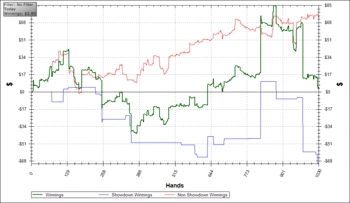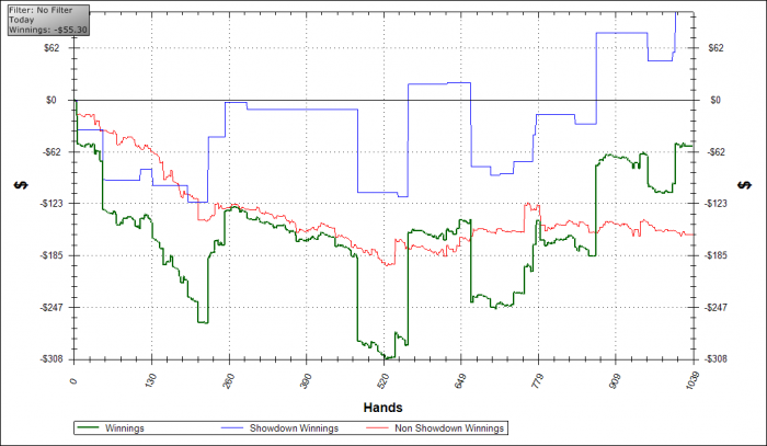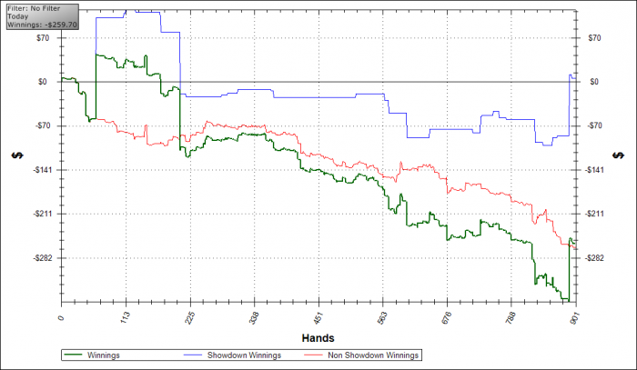 Сделал несколько ошибок, включая одну две совершенно ужасные на 70 и 60 долларов, но не из-за обилия столов, а просто по динамике по глупости. В конце сессии с удивлением заметил, что WTSD получилось меньше 25%, хотя я категорически отказывался выбрасывать карты.