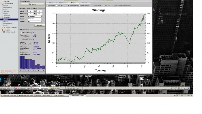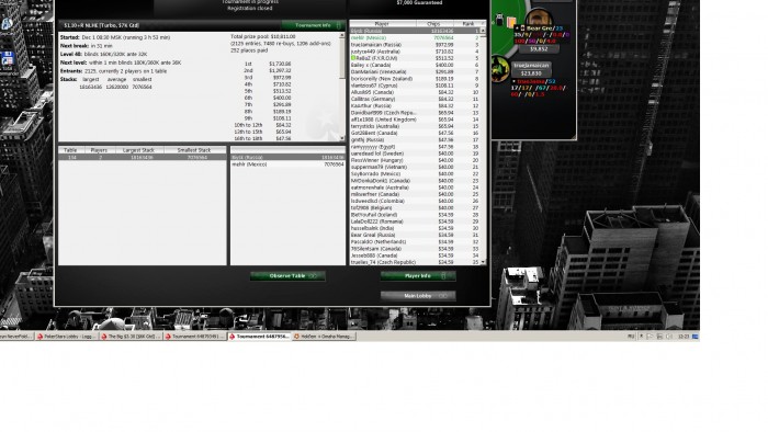 Тяжёлый месяц, откатал 183.5 часа чистого игрового времени+работал с хм/водами немало, при этом на работе были тяжёлые предновогодние недели, очень выложился в этом месяце, старался показывать лучший покер но в мтт постоянно убивали на стадии 18 тел, и думаю в мтт я очень не добрал, хотя месяц начинался чудесным утренним заносом 1-ого декабря В снг дела получше, апает+адаптировался к 3.5лимиту наконец то, и стал лучше понимать игру регов, стал занимать больше 1-х мест, и необычайно радует поле, кажется словно оно даже ослабло, видимо множество хороших регов ушло выше или в мтт + нашёл идеальное для себя количество столов. В общем, смотрю с оптимизмом в будущее, планирую катать 45max и выйти на микс 3.5+7+15, потому что мтт - совершенно меня не любит, либо я чего то не понимаю