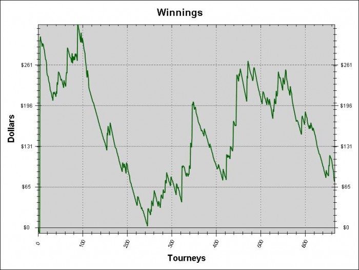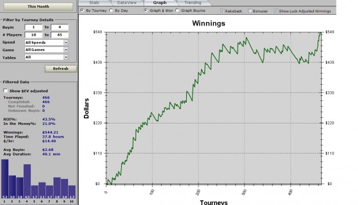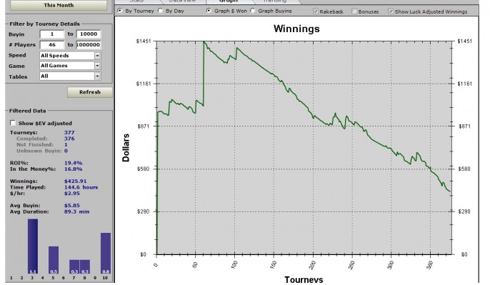 Всем привет, давно тут не появлялся, в покер до 15 ноября играл мало, в мтт с середины августа попал в крупный стрик, после неплохих мая июня и июля, в общем бр-ол был практически залит+истрачен, осталось 90$ и решил вернуться к тому с чего начинал свой путь в покере, 45max turbo, 5 дней назад открыл тему с марафоном на ттр-форуме для мотивации катать побольше - http://neverfold.ru/showthread.php?t=42177 График ноября на данный момент: BR=340.22$