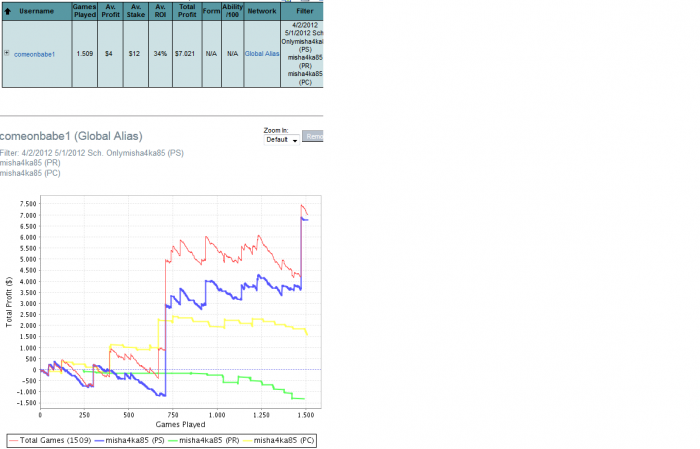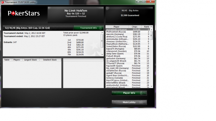 comeonbabe @ 1.5.2012 После в целом удачного апрельского марафона, решил помарафонить и в мае, тем более скупы, да и деньги нужны на лето. Цель следующая - 1,5К турниров, ну а по профиту ограничений нет. Отчеты и скриншоты(надеюсь они будут) буду выкладывать так же как и в апреле.