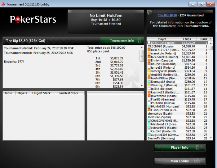 В Биге идет 6-й час, пробив опов по столу сначала обрадовался, 6 из 8 минусовые, стек был 240К, сразу не смог уловить динамику стола и залил половину стека в тонких раздачах, сложилось такое ощущение что каждый пытается доказать столу свою крутость, такого экшена и массы постфлоп игры я не видел на таких блинах давно, остался средний и тут кстати зашло: