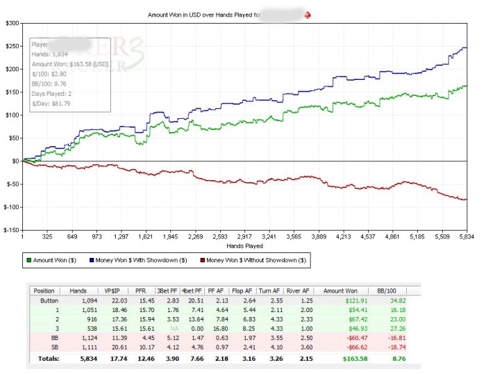 Статы кстати растут. 15/10/3.1, на постфлопе тоже агрессия добавилась немного. Как-то само, приходится отвоевывать потерянное. Но в основном продолжаю играть по карте и основной профит от фишей. Пока не понял как бить маньяков типа 30/28/15. Они вообще ничего не боятся (понимают, что играют против их имиджа) а рейзят на широком диапазоне. А определить где я после 3- или 4-бета на флопе я уже не могу :( Печаль. Маньяков на лимите мало, но надо учиться.