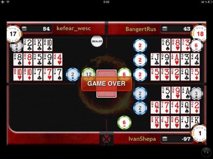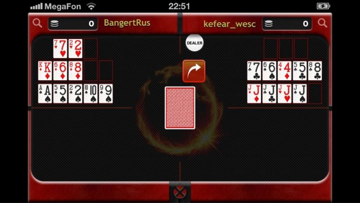 Если хотите играть таким же методом, вам понадобится ios устройство и платное приложение. Тут я, честно говоря, не знаю, есть ли для других платформ. В рублях стоит 229 вроде, скачивается в app store, называется Chinese Open Face Poker. Так же нужен будет аккаунт в game centre, но это стандартное приложение на ios устройствах. Все, с кем планируете играть, должны быть у вас в друзьях. А дальше совсем просто приглашаете друга и начинаете играть. Приложение сохраняет партии, что даже можно уснуть, и продолжить на утро, все останется на местах: и счет и расклады.