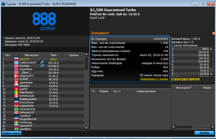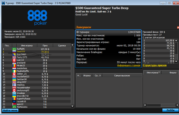 Если мучаться,что-то да получится! Несмотря на обидный риверы и занятые 7-8 места на покер доме, 888 наконец-то отдалось! Обидно было проигрывать весь день с дамами,но в конце дня они меня не подвели) Правда 3-макс отыграл неважно,из-за того что наигрыша практически нет,в ха уничтожил фиша и чистое первое Кстати отбирался как обычно через саттелиты.