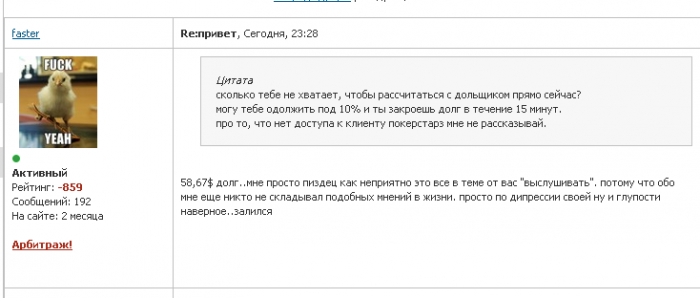 Я бы замазался на невозврат долга на 20 баксов, но вот репа -3000 намекает,что ты меня можешь кинуть :))))) А виновник пропадет скоро, этими минусами вы только убили в нем надежду стать честным, ему проще акк забыть и айпи сменить и начать жизнь с нового листа, чем отдать долг и еще тут плюсы выпрашивать. Это кстати одна из причин почему не минусовал его.