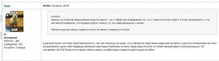 надо отметить, что и другие здесь тоже развлекаются. такие темы как брилианты - редки и очень интересны. обычно же как: 1) это не я; 2) это я, но простите - исправлюсь; 3) полный игнор. а здесь все по другому: прикольные отмазки, нелепые требования, отсутствие логики, это тебе не какой-нибудь интелигент. Случай интересен только с позиции чистой науки, процент отдачи долга приближается к нулю. ибо фастер не мужик, а вор, который ворует у своих. верни бабло фастер, переходи снова на сторону добра (хотя Империи Зла тебя не будет хватать).