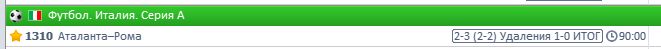 69. 16:00 Футбол / Италия / Серия А / Аталанта - Рома / Победа с учетом форы - Рома (0) @ 1.70 $ 35.00