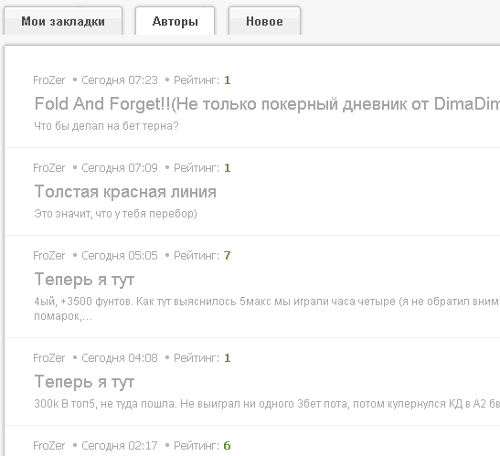Еще один вопрос: нельзя ли как-то разграничить, скажем цветом, посты в блогах и в остальных разделах? Как по "авторам" так и по "закладкам". Это для того, чтобы можно было быстро просмотреть посты автора, скажем, по раздачам в "Кэш-игре", а не в блоге какого-то кэшевика. Понятно, что камент может быть и в блоге, но часто каменты в блогах будут неигровые, а в темах по раздачам — наоборот.