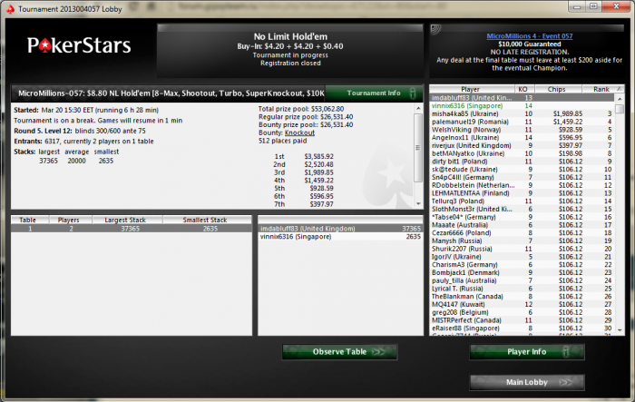 Последние 8 турниров остались, вроде как есть реальный шанс затащить, хотя сейчас от меня уже мало что зависит - тут кому пропрёт в последних турнирах. Но последние 3 дня сплю всего по 3-4 часа всего...
