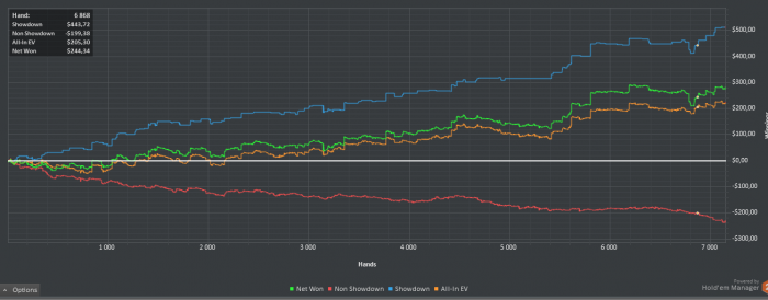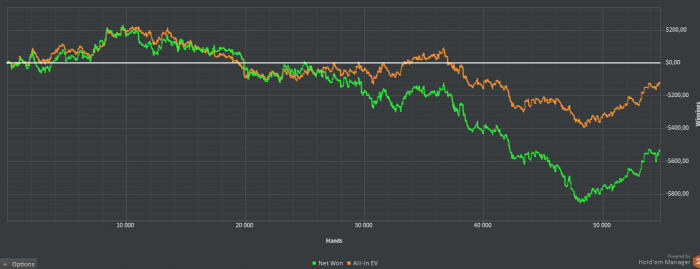 Поменял кое-что в игре.Красная не падает так сильно, но пока рано что-то говорить. Фиши начали хоть стеки отдавать.Один со мной выставился с 64 на JJ8 доске.Даже забыл что и такое бывает)