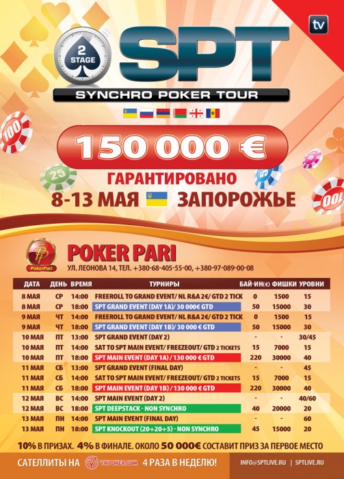 Synchro Poker Tour - это настоящие, плавные турниры с отличной структурой, в отличие от турбо турниров, где высока доля удачи, синхронные турниры в рамках SPT выделяются большим стартовым стеком, долгими уровнями и плавным увеличением блайндов. Во многих городах участниках, турниры SPT - единственная возможность для любителей покера принять участие в событиях международного масштаба. С 8 по 13 мая второй этап SPT пройдет в 15 городах СНГ. Не пропустите это уникально событие. Ниже можно увидеть структуру двух синхронных событий в рамках SPT, расписание турниров и контакты клубов партнеров. Удачи! и не забывайте, победителя SPT ждет около 50.000 Евро и это при байине в 220 евро!