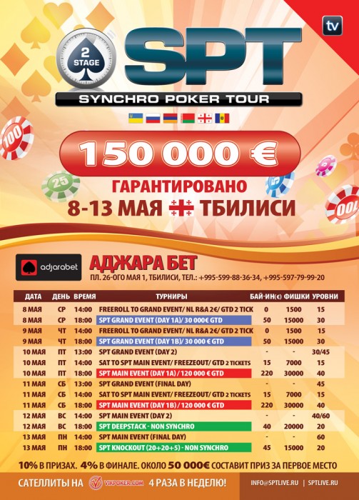 С 8 по 13 мая пройдет вторая фаза SPT в 15 городах СНГ. Но на этот раз уже будет целых 2 синхронных турнира (по 50 и 200 евро), с общей гарантией в 150 000 евро!