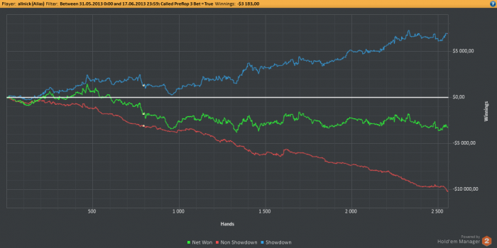 Второй способ исправить положение и я уже думаю попробовать его, это играть через минирейз префлоп, это самое простое, и возможно самое действенное, играть в 3бет потах меньшего размера удобнее будет и опять же дает больше возможностей на флопе, но так играть мне не очень нравится, хотя и понимаю что со временем неизбежно. Есть вероятность что отыграю минирейзом 1-2 недели что бы сравнить по фильтрам результат. (я понимаю что из за дисперсии это все может быть не правильно)