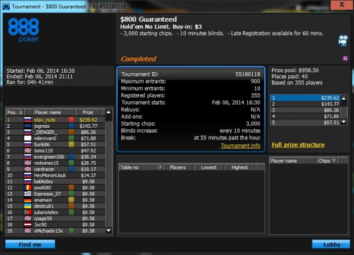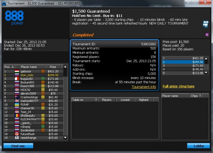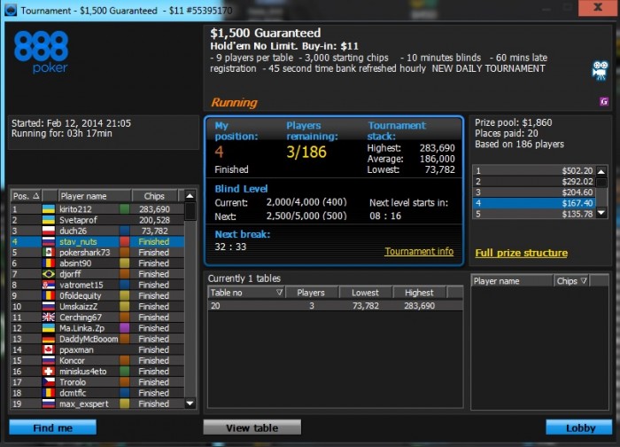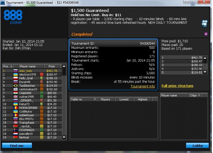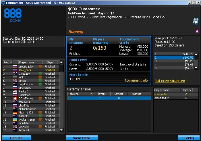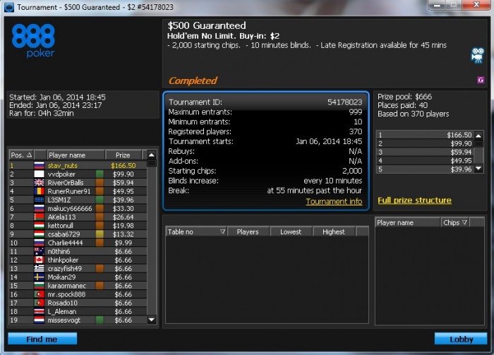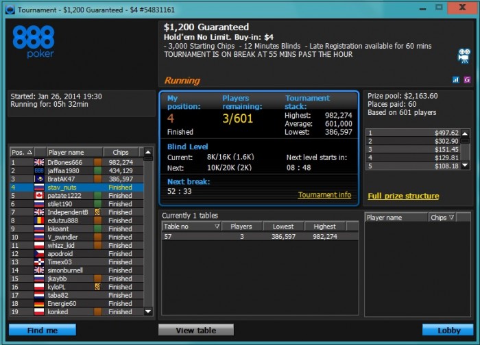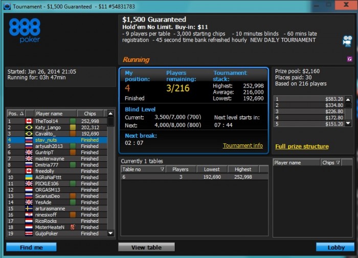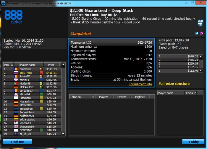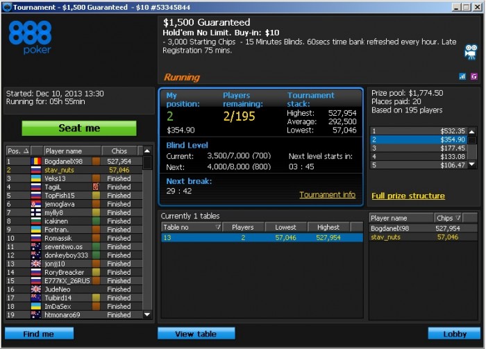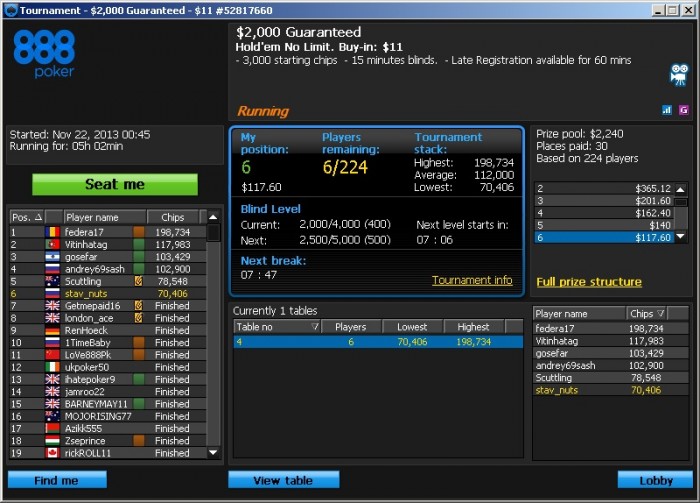Было вчера две финалки на 888, в дипе за 4$ и в дипе за 11$. В обоих топ6. Вылетел безобразно с обоих. Бездарно сыграл. Сам виноват. Второго скрина нет, там баксов 60 дали.