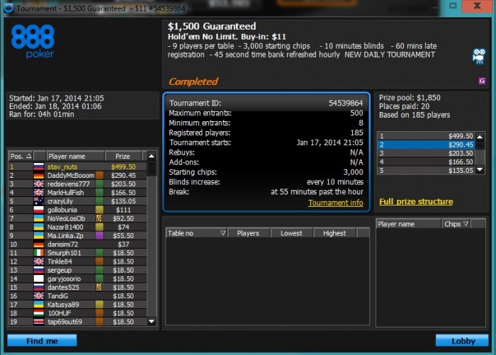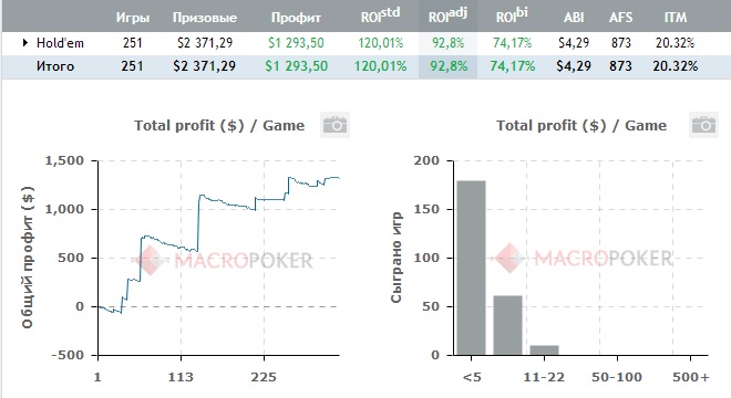 Итак, подведу итоги первого месяца этого года. Месяц выдался очень удачным. Еще в декабре 2013-го я был в полном отчаянии, т.к. залил почти весь БР. Уже хотел было искать работу. БРа хватало только на самые мелкие лимиты, а мотивации катать снова турниры по 1-2 доллара у меня не было. Но благодаря поддержке в нашей конфе в скайпе, я всё же собрался с силами и пошел штурмовать микролимиты. Только теперь я отказался от мультируминга. Убрал полностью ФТП и Пати. На старзах играю только долларовые килополя (а вдруг затащу!). Айпокер в этом месяце мне подарил только одну финалку, и ту в ребайнике за 50 центов, на которой я вылетел 9-ым. С последнего крупного заноса я проигрываю там уже где-то баксов 400, играя только долларовые ребайники. Самый надежный рум это, конечно же, 888. Там у меня самые стабильные результаты. Поэтому основная масса турниров там. Ну вот, собственно, сам результат января. Возможно, не совсем точный, но доверимся макропокеру. Всё никак не приучу себя вести статистику вручную.