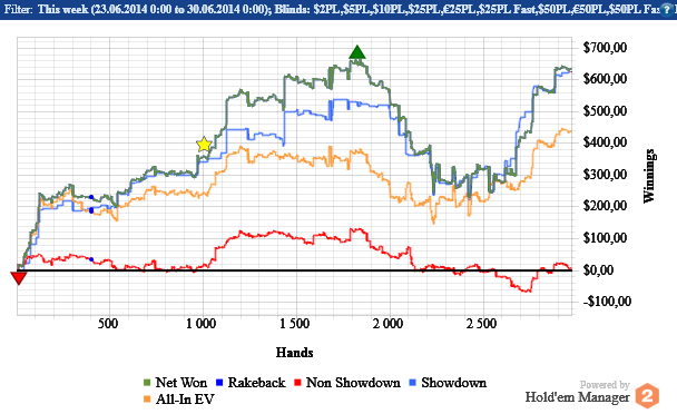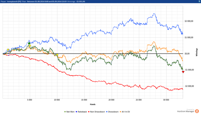 Из хорошего - отыграл 109 часов. Но из-за ев все равно проиграл $100 по марафону. А еще после той последней плотной недели появилась какое-то отвращение к омахе. Ну т е открываю столы с мыслями о том, что у меня лучшая в мире работа, а через 15 минут хочется все закрыть, ибо становится тупо скучно( Возможно, это связано с изменением стратегии в нитовую сторону, а возможно, просто устал морально. В общем, надо отдохнуть хорошенько, а там видно будет) ну и начало месяца у меня как обычно. Стабильность - признак мастерства блять.