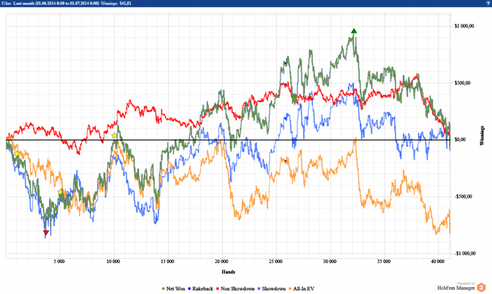 Играл 0.25, 0.5 и 0.5 ха. Сначала в ха шло неплохо, но в последний дни я добротно залился(не только в ха). Не обошлось без завышенных ожиданий и переоценки своего скилла, т к в конце месяца когда куллерило + заходило слабым оппам, я не выдержал давления, что говорит о скилле игрока.