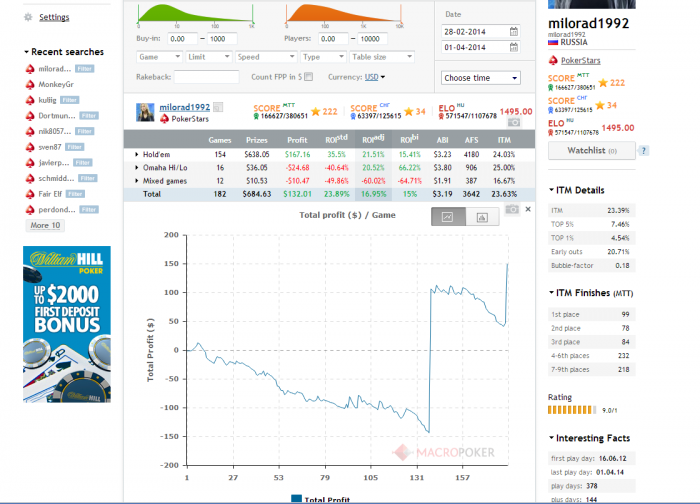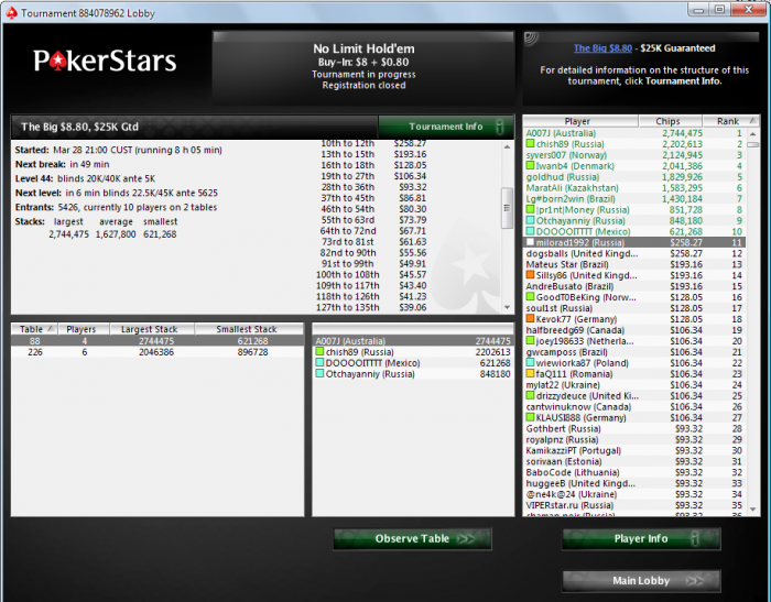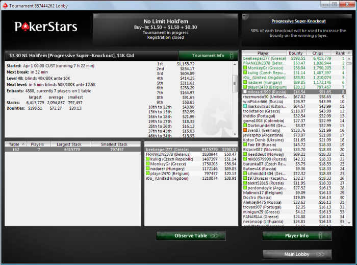 Poker Stars $1.50+$1.50+$0.30 No Limit Hold'em Tournament - t1000/t2000 Blinds + t250 - 9 players -