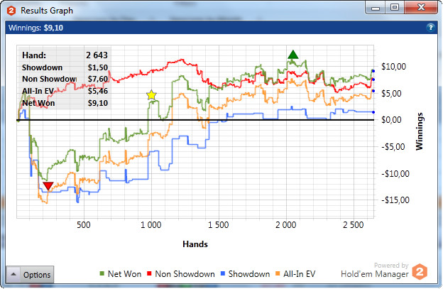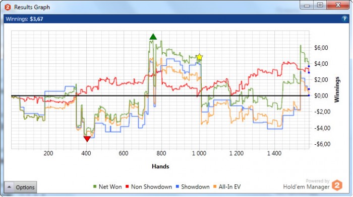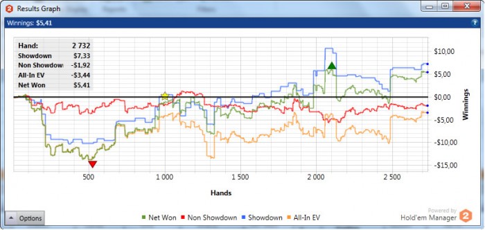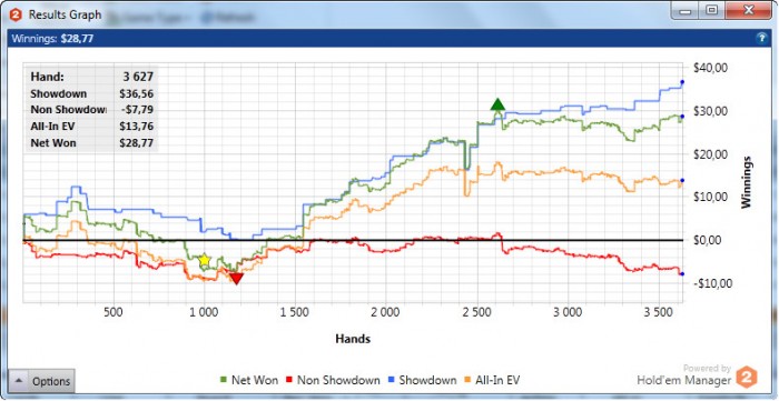 Вчера чувствовал ужасно из-за усталости и сонливости. Поэтому, посчитав по EV, я принял решение проспать весь вчерашний вечер Сегодня весь день думал отыграть вдвойне больше рук. Но не тут-то было после того как я поел после пар, я лег посмотреть фильм, после которого собирался сесть катать... но во время фильма меня вырубило и я проспал до 10 вечера в итоге за столы я сел в начале двенадцатого, но из-за сна большего желания играть уже не было, поэтому поиграл всего 50 минут... и вот какой график получился За время игры были пару крупных раздач: