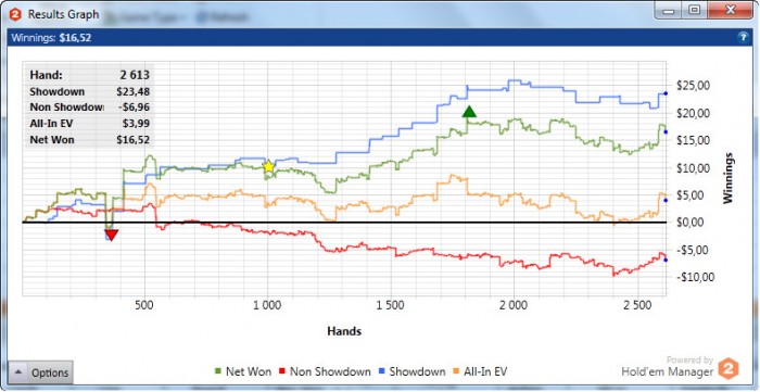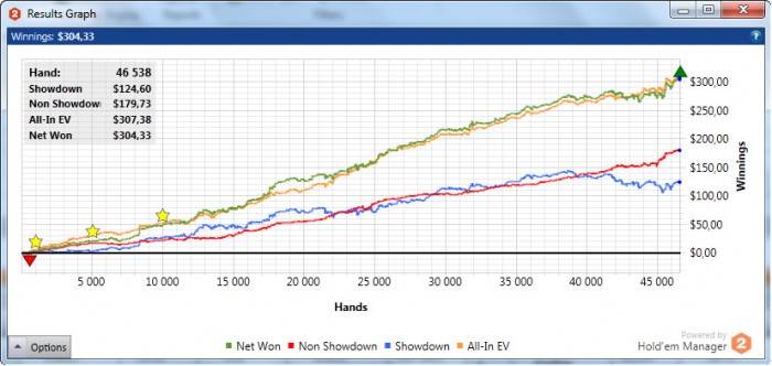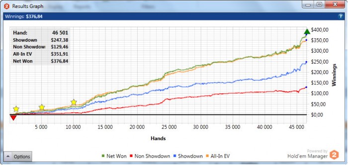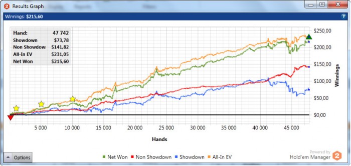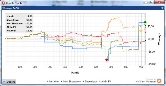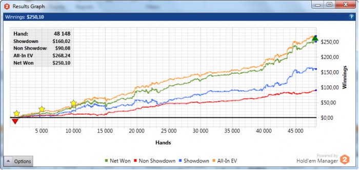 Сегодня играть не планировал... Игры не предусматривалась из-за завтрашней сдачи курсовой Придя с пар, я сразу сел за столы на старзах ноутбук и начал считать курсовую. С помощью все различных учебников и справочников научного метода Ctrl+C & Ctrl+V курсач был готов спустя 4-5 часов. Осталось лишь эту хрень курсовую распечатать завтра и сдать В 20:50 я освободился. Полон сил, энтузиазма и воодушевленный вчерашним стримом NL_Profit'a я открыл PokerStars. Играть старался сегодня более агрессивно, чем обычно: ставил блефовые 4-беты, чаще рестилил, сквизил. Рук конечно было сыграно немного, но красная линия меня радует. Надо и дальше продолжать в то же духе.