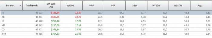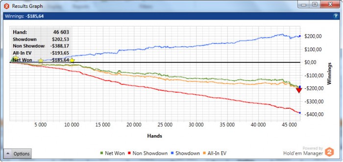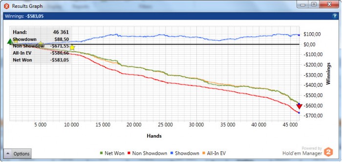 Скажите, пожалуйста, такой большой минус на блайндах это вообще нормально, с учетом того, что большая часть графика с 6-макс столов? Ведь общая красная линия идет у меня в минус только из-за блинов, а терять столько денег не хочется. Как работать над этим? Что посоветуете?