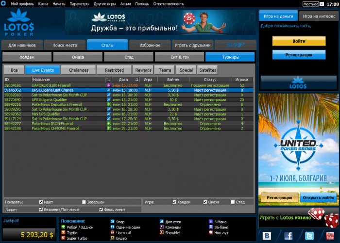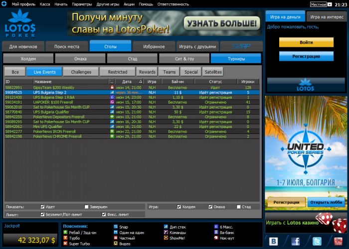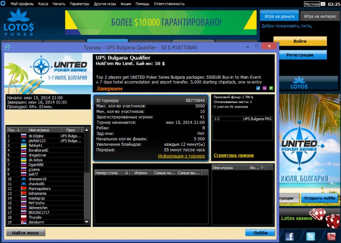 Итак, сегодня в 21-00 состоится единственный квалификационный турнир в LotosPoker, по итогам которого двое счастливчиков получат турнирные пакеты United Poker Series в Болгарию. Бай-ин: $50. Сегодня ещё возможно запрыгнуть на подножку уходящего поезда и принять участие в двух специальных сателлитах UPS Bulgaria Last Chance за $5,5 - как минимум один билет в квалификационный турнир гарантирован. Турниры стартуют в 19-00 и 20-00 по Москве.