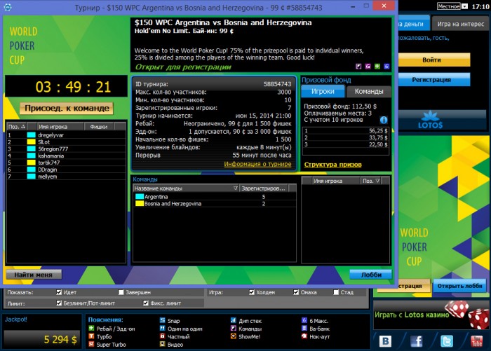 Кроме того, в рамках серии турниров в честь Чемпионата Мира по футболу, сегодня состоится очередной тур - $150 WPC Argentina vs Bosnia & Herzegovina. В серии разыгрывается призовой фонд более $10,000, включая турнирные билеты для лучших игроков. Победитель получит более $1,000! Подробнее здесь: Более $10,000 причин следить за ЧМ2014 вместе с LotosPoker! Турниры, как всегда, можно найти во вкладке "Турниры" - Special в лобби клиента. Желаем удачи!