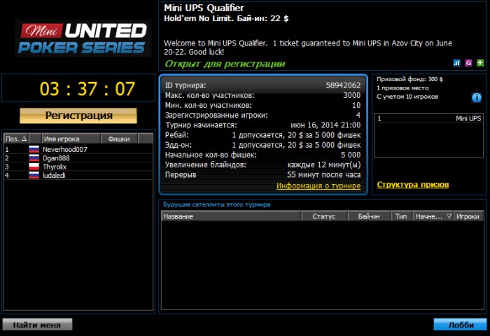 Сателлит на LotosPoker разыграет как минимум один бай-ин Mini UPS размером 10,000 рублей.