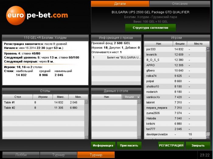 Просто сейчас на Europe-Bet.com идет недельный финал, который разыгрывает минимум один пакет в Болгарию. Поздняя регистрация еще в силе, приглашаем желающих выиграть пакет на сумму 1035 евро. Бай-ин 110 лари (62 доллара).