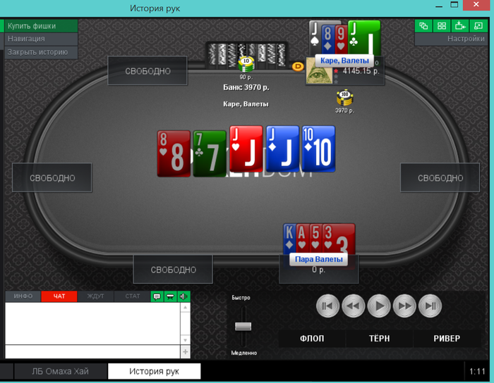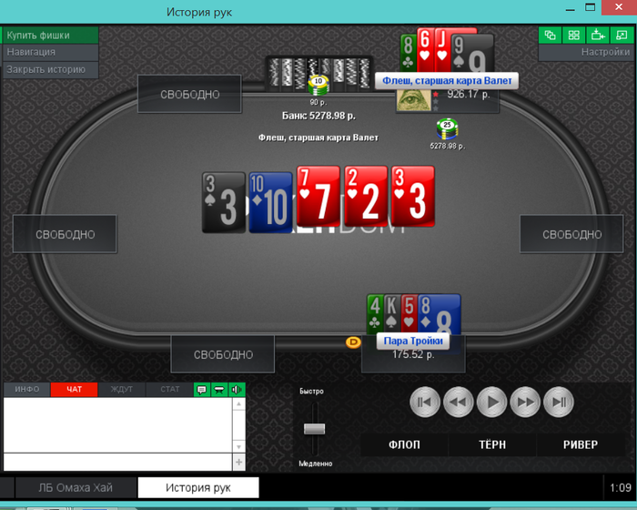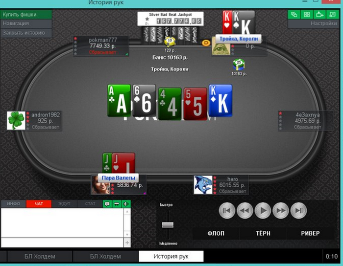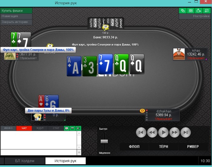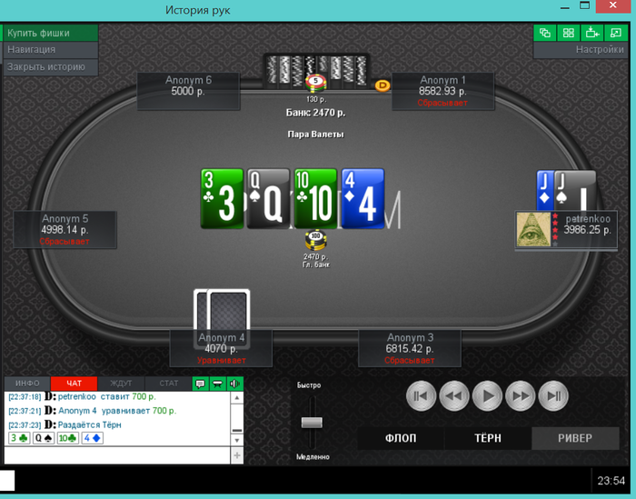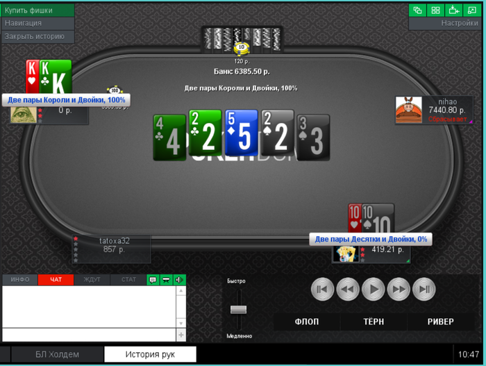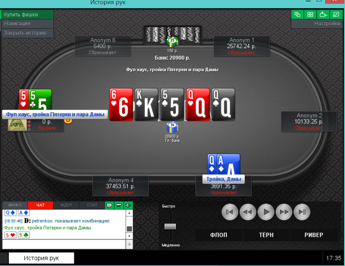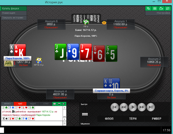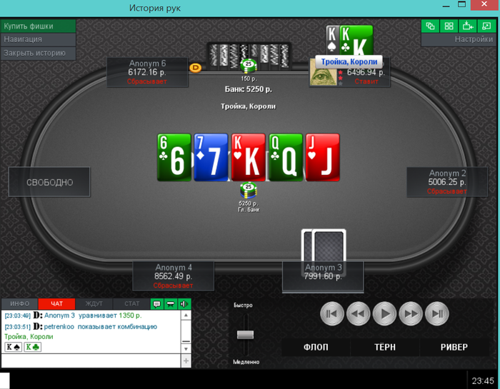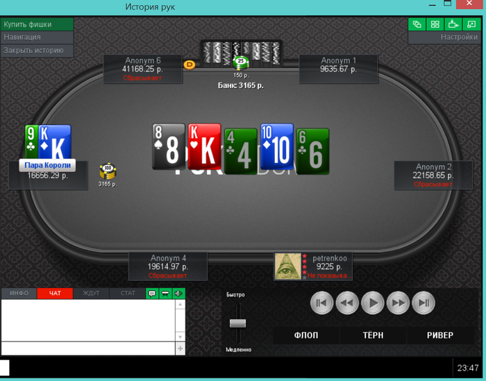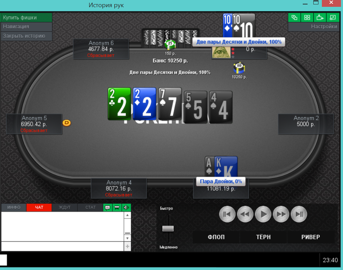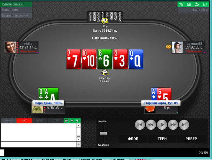 Еще пара раздач, ставил 2 барреля и чекнул ривер, получил ожидаемое в первой, а во второй выставился на флопе, а оппонент сетовал на ГСЧ.
