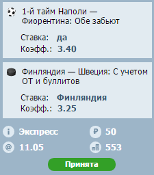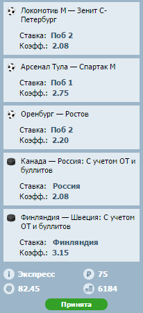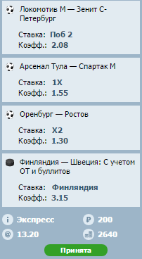 1) Зенит просто классом выше чем локо, да и очки нужны, тут особо голову ломать не нужно или зайдет или нет. 2) Арсенал тула - Спартак. Есть подозрение что если они проиграют эту игру чтобы не обламывать Арсенал им никто слова не скажет. А так, пока Арсенал готовился к игре, Спартак скорее всего во всю бухал после победы над Тереком. Первые будут до последней минуты бегать, нужно ли это Спартаку? Хз.. Довольно таки интересный тур предстоит.. 3) Оренбург - Ростов. И тем и тем нужны очки, все-таки турнирная таблица сил команд должна сказаться, а там посмотрим что такое Оренбург.. 4) Россия - потому что буду болеть за наших... 5) Фины - потому что Швецию сейчас так сильно прогрузят что хрен она куда выйдет.. Ну и как с Аяксом, уровень игры примерно равный, кеф глаза режет..