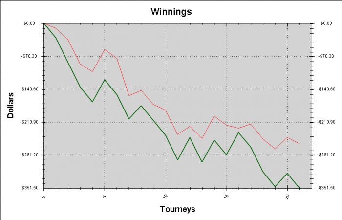 В крайне сонном и тормозящем состоянии откатал дневную норму в 20 турниров. 14-6,+280$, 3 раза попал в кулеры ( фул в фул, топ-трипс в фул, 2 пары в 2 пары) , 2 раза переехал снизу, затащил больше половины монеток. Красная линия пошла в ноль:) Играл спокойно,почти без мувов, оппы сами творили хрень типа таких))