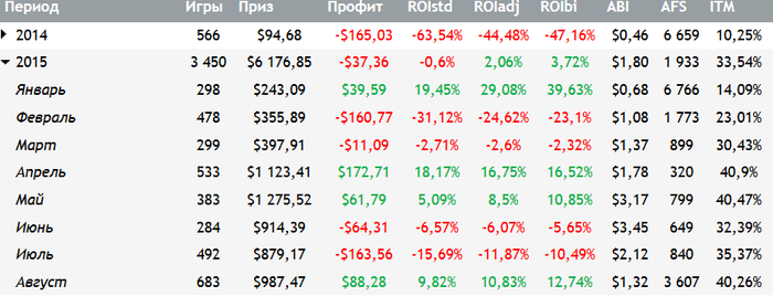 Концовка августа не задалась, последние три сессии минус $30. Итог по августу +$96 (сегодня-завтра выложу графики за месяц). Задачу на август я не выполнил, цель была сделать +$200 за месяц, а вышло в половину меньше. В целом месяцем доволен, не смотря на смазанную концовку это был хороший месяц. Положительные моменты августа: наибольшее количество турниров за месяц (я не отыграл 1000 турниров, но все равно это лучший результат за этот год); отказался от МТТ которые мне не по БР; поработал над своей игрой. считаю, что 1,5 лимит я бью и продолжу в сентябре формировать БР под 3,5 лимит Задачи на сентябрь: - отыграть 600+ турниров - увеличить БР до $300+ (сейчас $196) и подключить 3,5 лимит