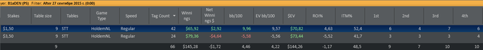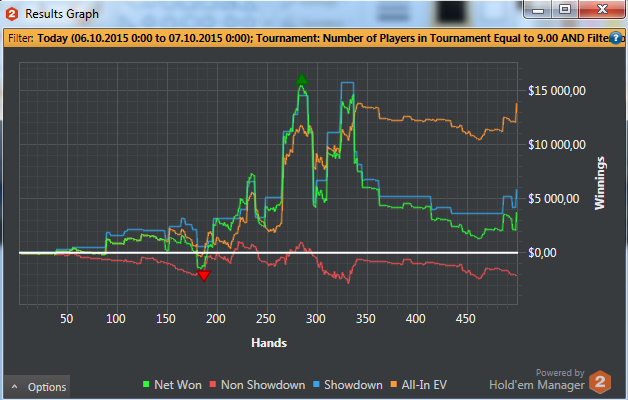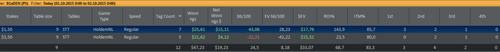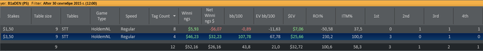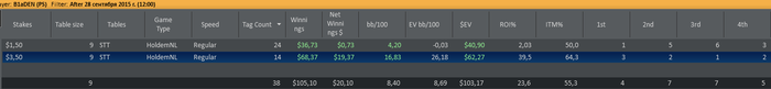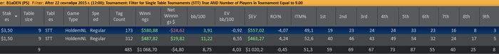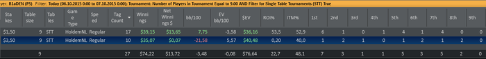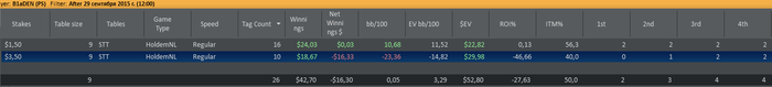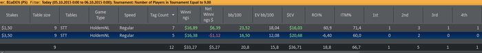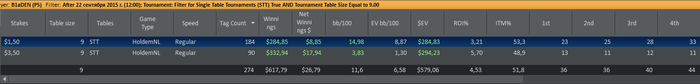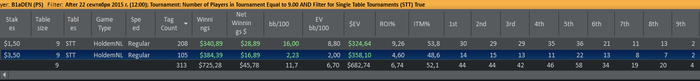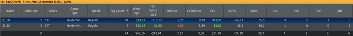 Отыграл два сета: первый сет в + турниры по 3,5 и минус по 1,5 (1 попадание в ИТМ из 7ми турниров), второй сет в точности до наоборот - одно попадание в итм в 3,5 и 6 первых мест в 1,5. Итог сессии и в фишках по 3,5 за сегодня