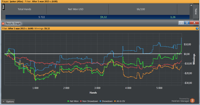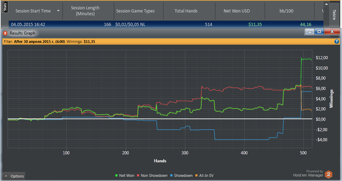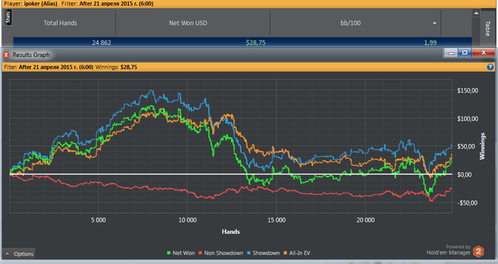 Потом были дела по работе, в общем, неделю в покер вообще не играл, ну кроме рейтинговых турниров от PJ иногда (но разве это покер?) и из-за этого не успел добить SilverStar на ПС. Теперь нет мотивации в кэш играть. Но надо как-то себя заставить. Ещё очень сильно соскучился за МТТ и неделю назад перекинул 50 баксов на айпокер, потому что катать килополяны на ПС с моим банкроллом смысла нет. Сыграл чуть больше 100 турниров, результатами пока доволен. Не знаю как настроить ХМ чтобы он отображал профит по МТТ, потому что он мне показывает какие-то нереальные цифры и непонятные графики, по которым я поднимаю миллионы)))) Поэтому отчёт по МТТ веду по старинке в эксель.