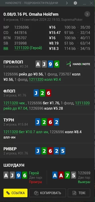 В моменте я задумался над нашей общей стратегией тут с нашей рукой. Мне показалось, что должен быть микс, вот только частоты я не могу прикинуть. Дальше я принимал решение исходя из оппа. Мне казалось, что он он сыграет пот кол со множеством оверпар + J. Либо АА с парой на борде. Поэтому принял решение о ч/р.