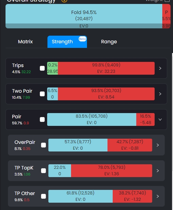 Ты попал в ловушку FlopHero) На данном этапе - это довольно бесполезный инструмент из-за того, что там по 2-4 сайза во всех ветках посчитаны. Люди так не играют, а наша стратегия зависит от стратегии наших оппов. Прежде чем смотреть тут свой ответ, надо отправится сначала в рендж пота флопхиро за МП и увидеть там 0.1% от общего ренджа. То есть там буквально несколько комб будет, и свой ответ ФлопХиро на ББ строит как раз из-за того что там ульраузкий диап. Смотреть это вообще бессмысленно.