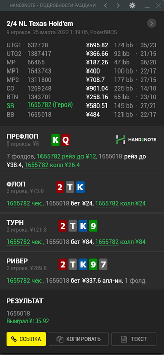 alesik, спасибо, очень странная выборка рук к риверу, как будто ошибка где то в префлопе, там расчет еще на атс, в9с его нет почему то вообще в бете, хотя это чуть ли не единственная адекватная комба из блефов которую легко превратить. Префлоп вообщем не совсем корректен, и там Qxs мелких будет точно сильно меньше при 3бете 14. Но даже если тут ев кола 0. В реалии там все еще хуже на человеческий лад, т.к там ах без попаданий вообще не будет, к риверу и Q5-Q2s тоже.