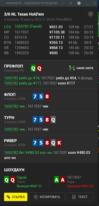 Ну как общий, КК у 161 точно нет, да и АА второй раз чекать будут в малом %, так? У обоих более возможны АК, при этом всё таки у 165 преимущество есть, потому и АК может так сыграть, при этом имея натсы, и 161 вынужден колить. Или в 3/6 все уже давно как боты сидят?