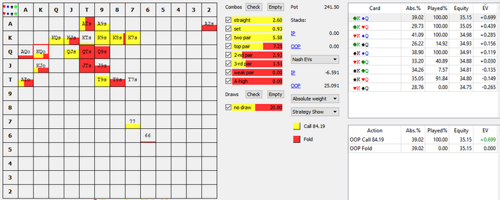 Короче на первый взгляд это всегда кол, по факту всегда фолд. Вс рега который способен превратить тут Тх, кол но таких мало. (Тут 3 комбы которые легко превратить человеку с учетом локов, вт, в9 и 87 (и то с сомнительными частотами цб) просто т.к деваться некуда. Это вердикт, там есть еще более глубокие рассуждения и комбинаторика перечислена но это уже оставим.