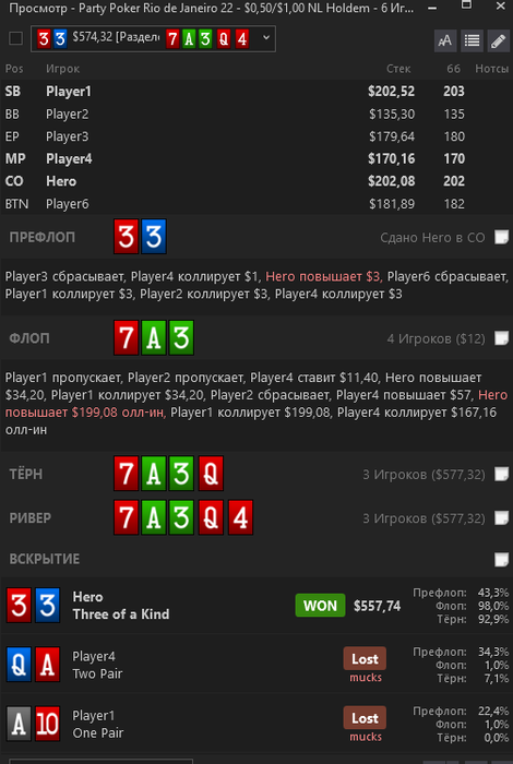 З.Ы. На бросе обычно фиши крепкие достаточно. Вероятно, ввиду сложности регистрации, там обычно рыба не первый раз карты видит. Бывает и фолдят довольно сильные и красивые руки неожиданно. Такие подарки большая редкость