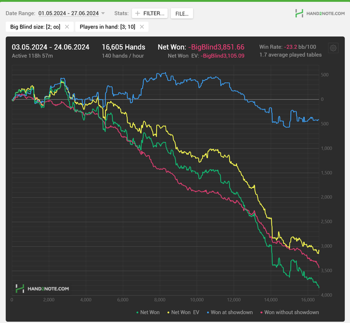 Dzont @ 31.05.24Словить просадку в 40 БИ на верхнем - это пиздец какой-то. Очень неприятно. В моменте кажется, что ты такой уникальный и даже у ребят, которые по 10 лет катают, такого никогда не было (нет). Но если раньше после минусовых месяцев, у меня было какое-то предвкушение, что сейчас начнет отдавать, то сейчас кажется, что мне суждено просто нл100 играть до конца дней. А я совсем не за этим приходил в покер. Совсем расклеился я, в общем.