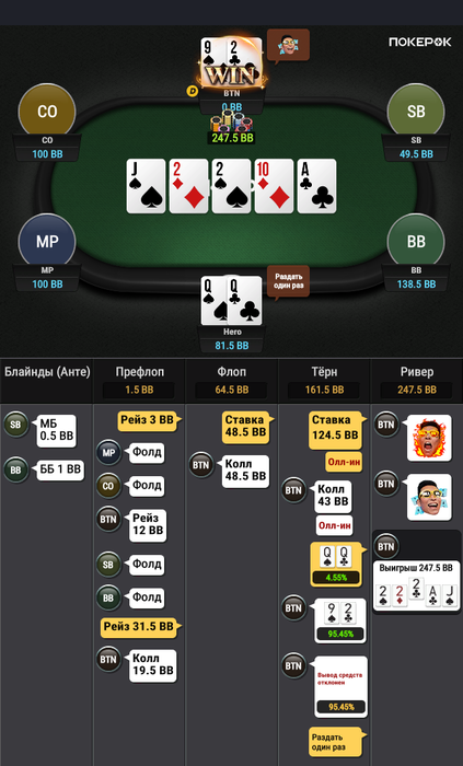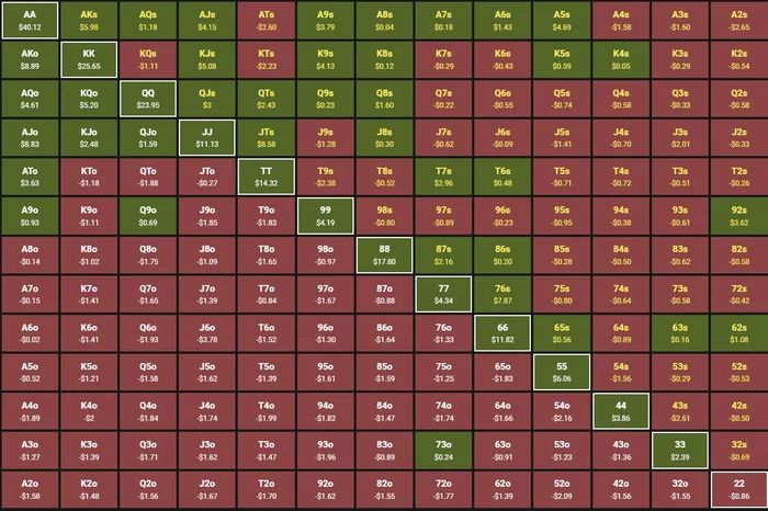 SIGREX @ 25.09.25А что диапазон АА,KK,QQ,JJ имеет выше шанс попасть в сет по сравнению с 55,44,33,22? Или АК чаще попадает в пару,чем 72о? Дело не в доездах, дело в силе ренжа. АА-JJ чаще ловят оверпару, а АК ловит топпару, а вот 22 никогда не станут оверпарой. Но у 22 иногда много эквити, вопрос в ее реализации, ведь часто мы играем чек фолд не попав в сет. Ребята, хватит собирать пасьянс. Узкий диап хорош против игрока который несоразмерно этому вашему узкому диапу продолжает- маньяк рейзом, телефон коллом. А как играть если опп открылся 35% с баттона и сфолдил 85% на ваш 5% трибет? Ну и кто кого выиграл? Узкий ренж выиграл широкий? Узкий ренж уничтожен, именно по причине своей узости и неэластичности игрока к расширению.