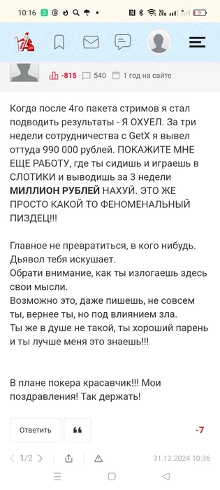 Ты проиграл это пари! Но вместо признания ты гонишь дичь, по типу отыграл раньше, "левая прибыль", смешал людей коней свиней. Я редко оставляю отзывы, но тут надо, может помогу кому-то с тобой не иметь никаких дел...